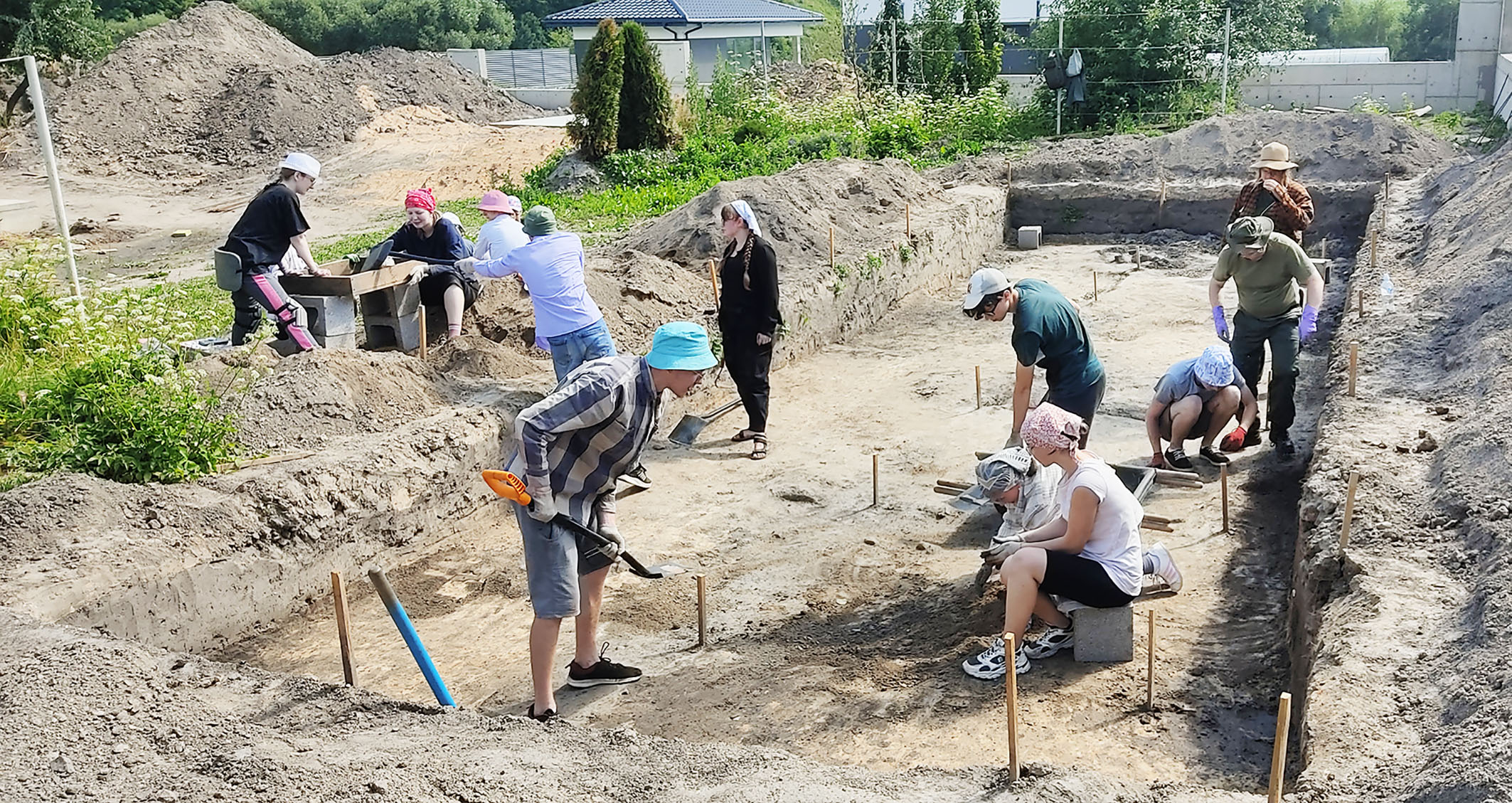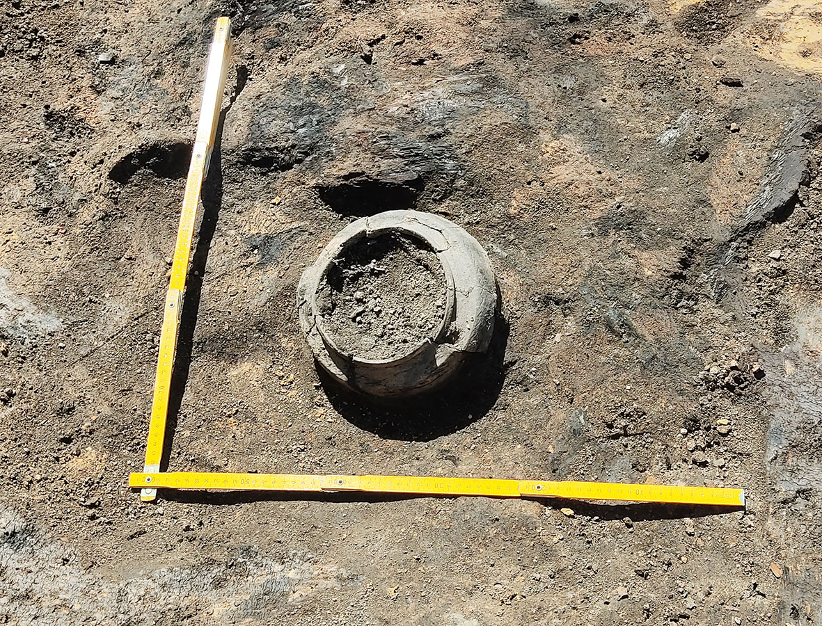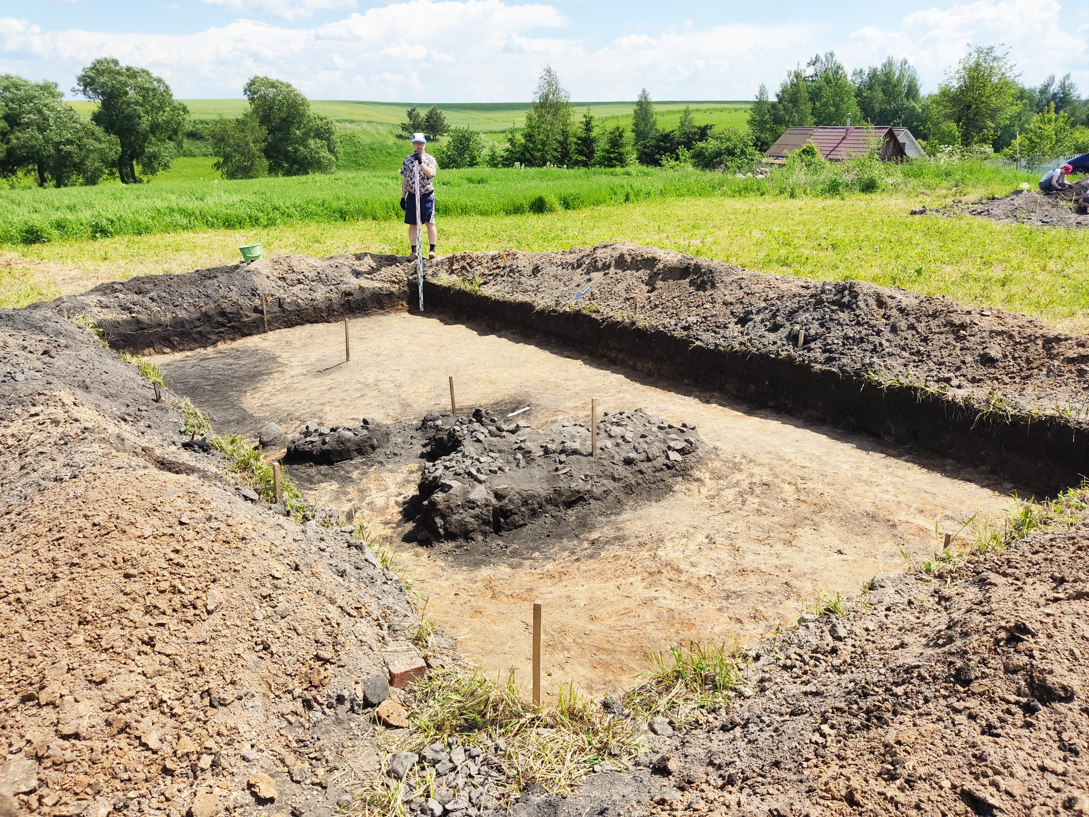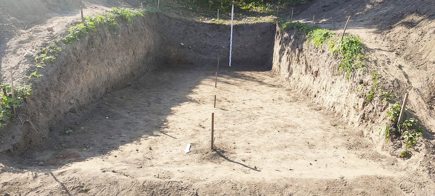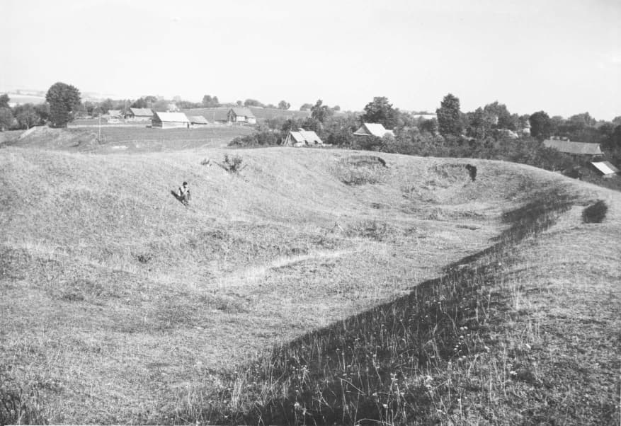 У 2022-2023 гг. падчас даследавання заглыблення ў паўднёвай частцы вала Вялікага гарадзішча былі знойдзены следы згарэлай пабудовы, якая адносілася да сядзібнага комплексу. Драўляная пабудова, у якой знаходзілася печка з кафлі, была ўрэзана ў вал. Яна знікла ў выніку пажару ў другой палове XVII ст. і больш не аднаўлялася. Ад будынка захаваліся развал печы, якая была складзена з цэглы пальчаткі і звонку ўпрыгожана зялёнапаліўнай кафляй, фрагменты згарэлай падлогі і бэлек. Зверху пажарышча было засыпана мусорам XVII–XIX стст. У выніку знойдзены фрагменты глінянага, паліўнага і дымлёнага посуду, вазоны для кветак, фрагменты шкляных бутэльак, фрагменты фаянсавых талерак, у тым ліку вырабленых на “Свержанскай мануфактуры”, фрагменты разнастайнай кафлі, вырабы з жалеза і каляровага металу, манеты.