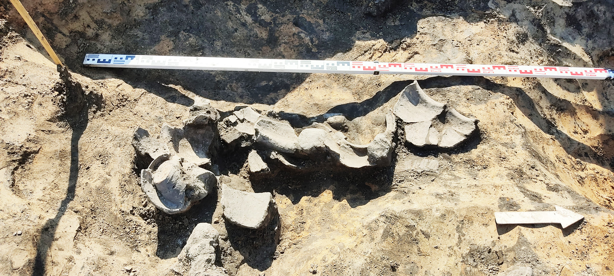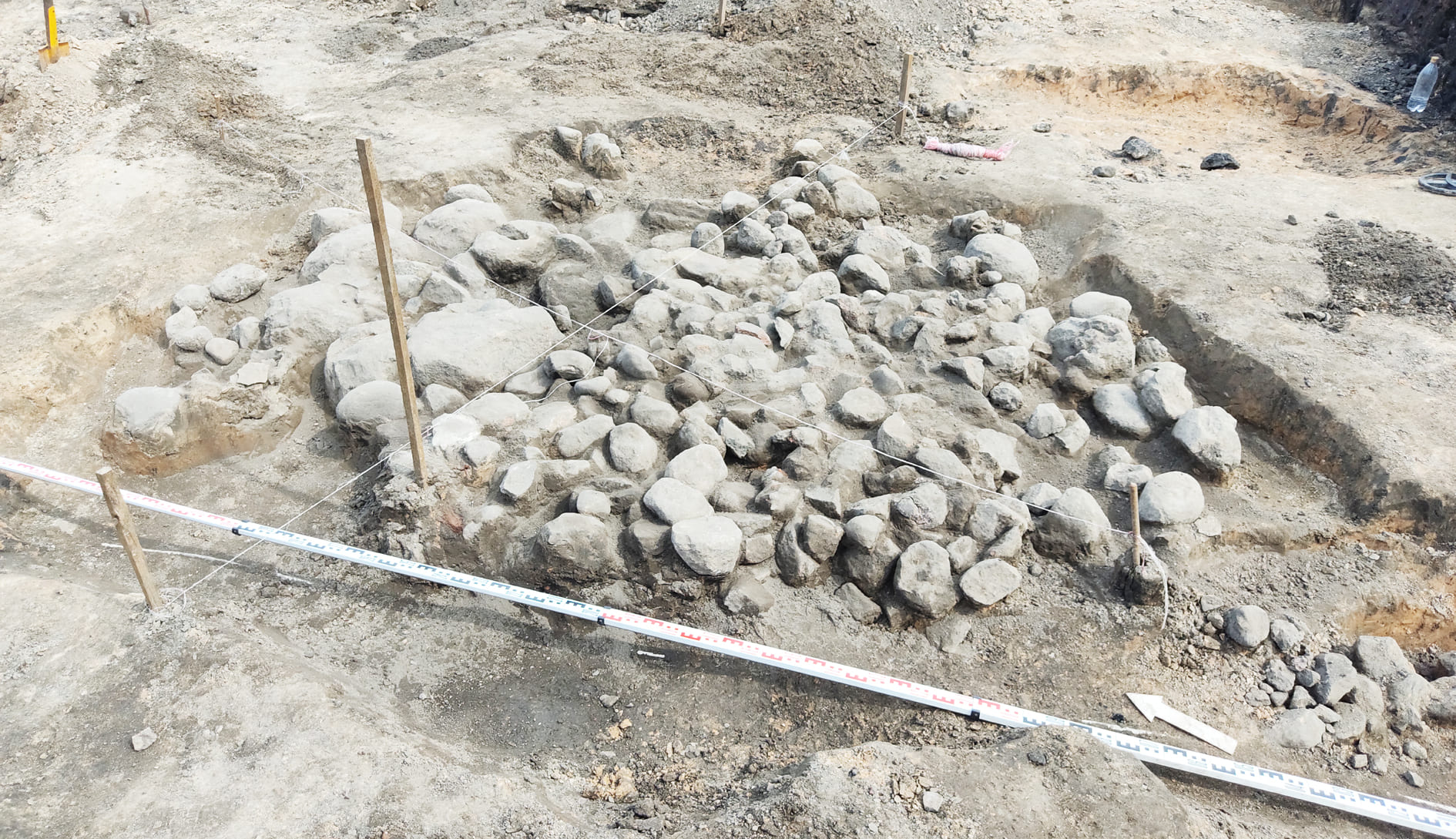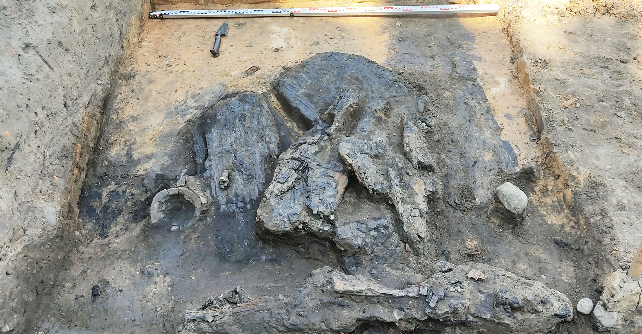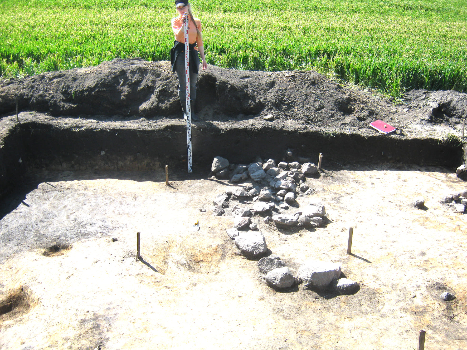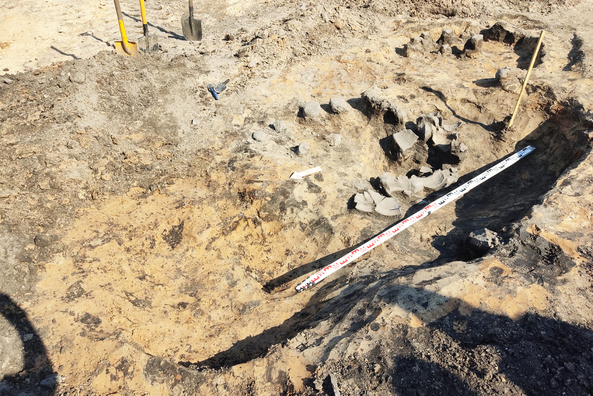 У 2022-2023 гг. падчас даследавання заглыблення ў паўднёвай частцы вала Вялікага гарадзішча былі знойдзены следы згарэлай пабудовы, якая адносілася да сядзібнага комплексу. Драўляная пабудова, у якой знаходзілася печка з кафлі, была ўрэзана ў вал. Яна знікла ў выніку пажару ў другой палове XVII ст. і больш не аднаўлялася. Ад будынка захаваліся развал печы, якая была складзена з цэглы пальчаткі і звонку ўпрыгожана зялёнапаліўнай кафляй, фрагменты згарэлай падлогі і бэлек. Зверху пажарышча было засыпана мусорам XVII–XIX стст. У выніку знойдзены фрагменты глінянага, паліўнага і дымлёнага посуду, вазоны для кветак, фрагменты шкляных бутэльак, фрагменты фаянсавых талерак, у тым ліку вырабленых на “Свержанскай мануфактуры”, фрагменты разнастайнай кафлі, вырабы з жалеза і каляровага металу, манеты.