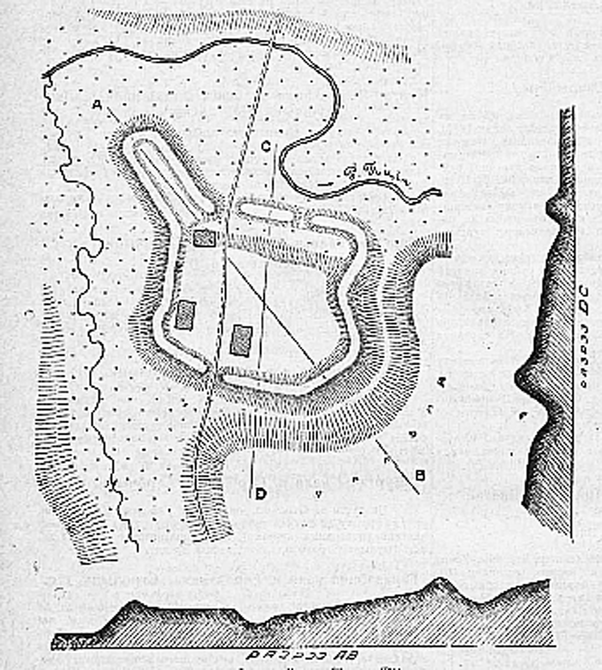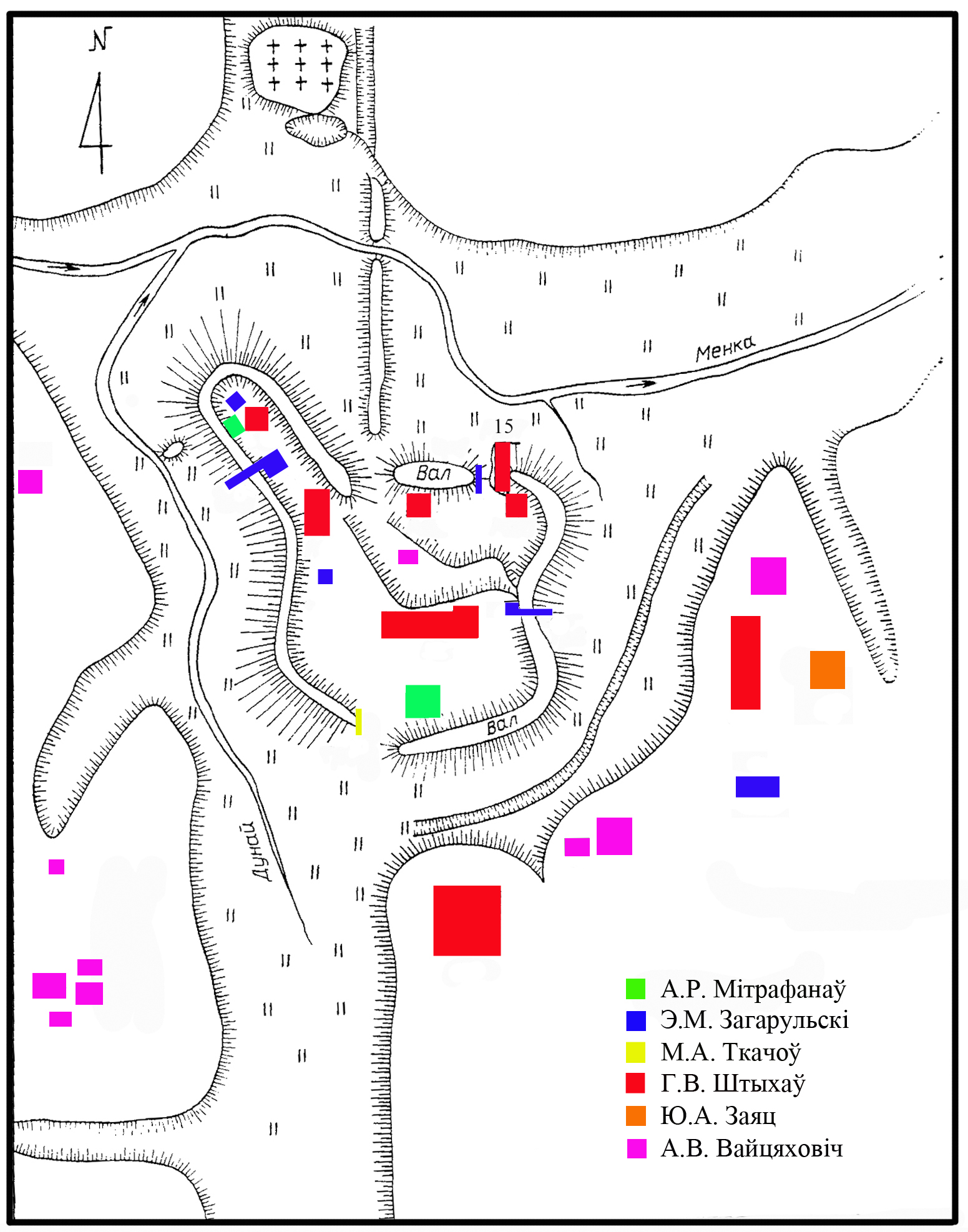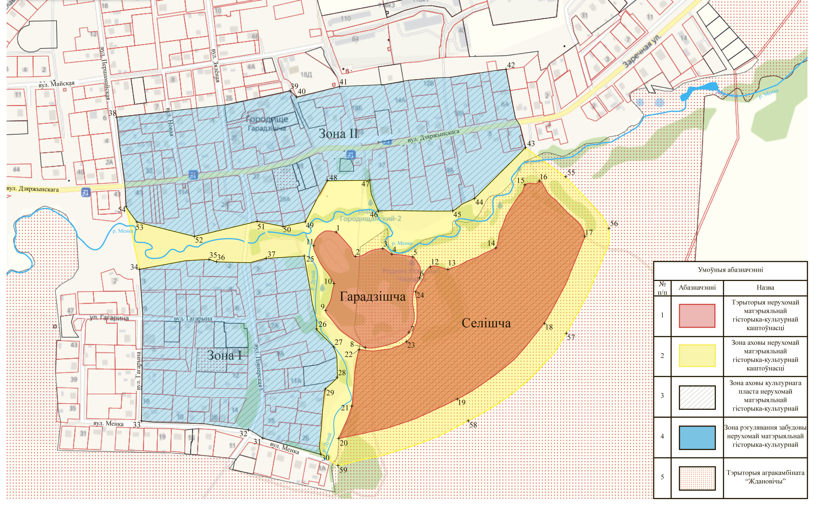 Археалагічны комплекс, вядомы як паселішча на рацы Менцы, скаладаецца з умацаванага гарадзішча – дзядзінца, чатырох селішчаў, – пасадаў і некалькіх курганных груп, якія ўжо цалкам развараныя. Гарадзішча размешчана на правым беразе ракі Менкі (правы прыток ракі Пцічы). У яго склад уваходзяць дзве часткі – малое і вялікае гарадзішча. Малое гарадзішча знаходзіцца на мысе, утвораным зліццём ручая Дуная і ракой Менкай. Яна мае авальную пляцоўку памерам 80 х 16 м, невысокія валы акружаюць яго з трох бакоў. Вялікае гарадзішча прымыкае да малога з паўднёва-усходняга боку. Памер яго пляцоўкі 120 х 120 м. Гарадзішча з усіх бакаў акружана валам высотай 8–12 м, у якім маецца тры разрывы.