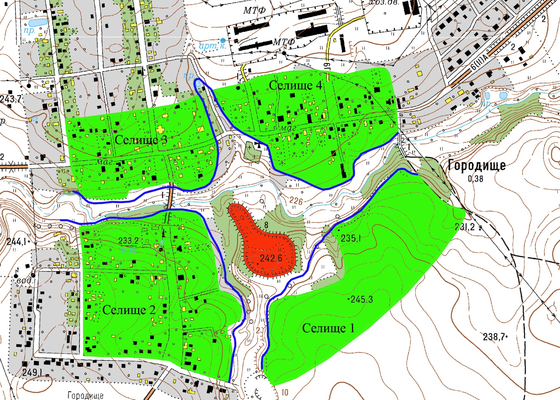 Чатыры селішчы знаходзяцца вакол гарадзішча. Селішча 1 непасрэдна далучаецца да гарадзішча з паўднёва-ўсходняга боку і аддзяляецца ад яго ровам. Яго плошча складае прыкладна 9 га. Селішча 2 размешчана з заходняга боку пекла гарадзішча, на процілеглым, левым беразе ручая Дуная. Яго плошча не больш за 10 га. Астатнія два селішчы знаходзяцца на левым беразе Менкі. Гэтыя селішчы падзяляюцца ярам, верагодна, рэчышчам перасохлага ручая. Плошча селішча 3 прыблізна складае 6 га, а селішча 4 - 4 га. Сёння селішча 1 расхінаецца, астатнія трапілі пад забудову сучастнай вёскі Гарадзішча.