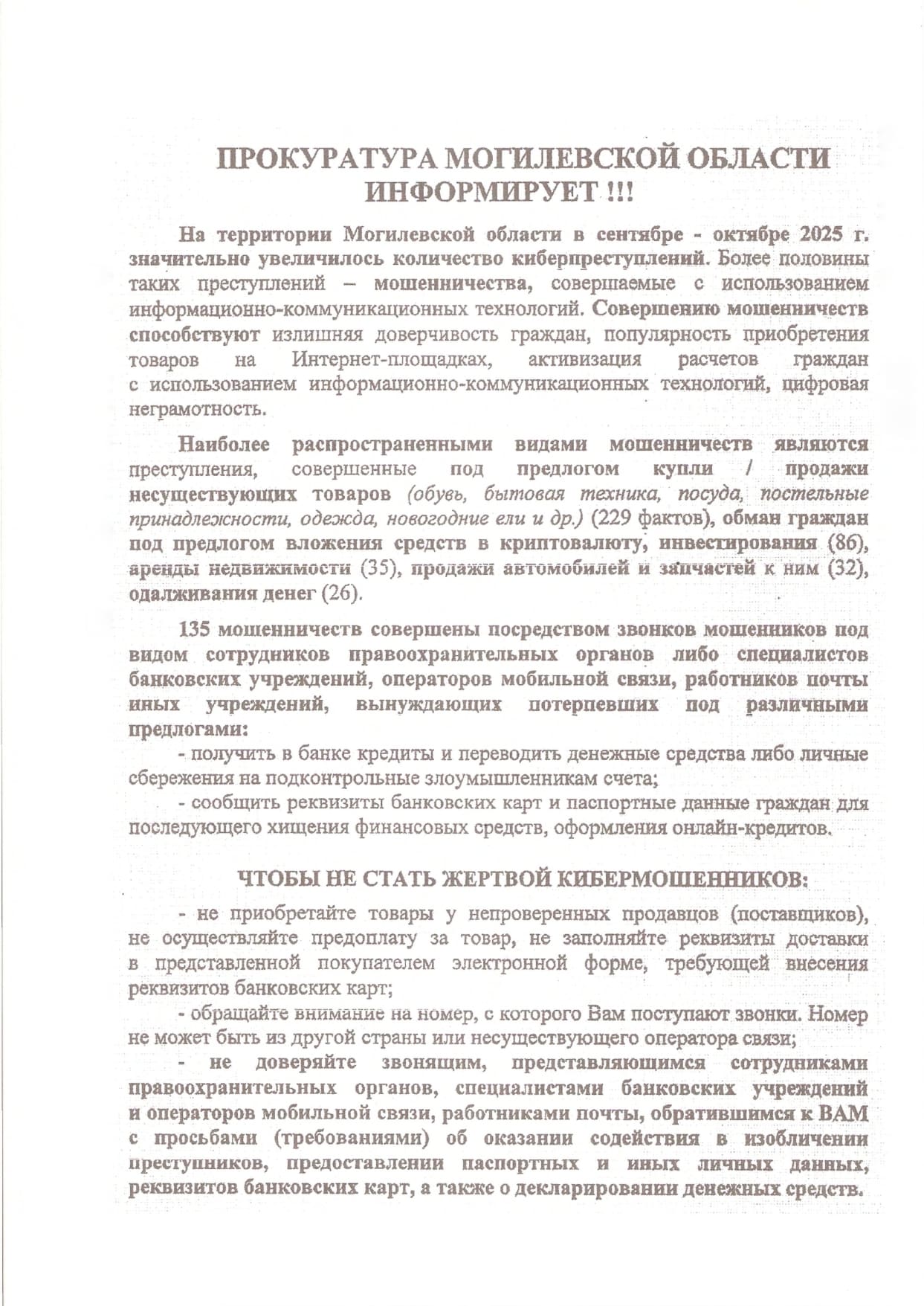 На территории Могилевской области значительно увеличилось количество мошенничеств, в т.ч. совершаемых с использованием информационно-коммуникационных технологий. Совершению мошенничеств способствуют излишняя доверчивость граждан, популярность приобретения товаров на Интернет-площадках, активизация расчетов граждан с использованием информационно-коммуникационных технологий, цифровая неграмотность.