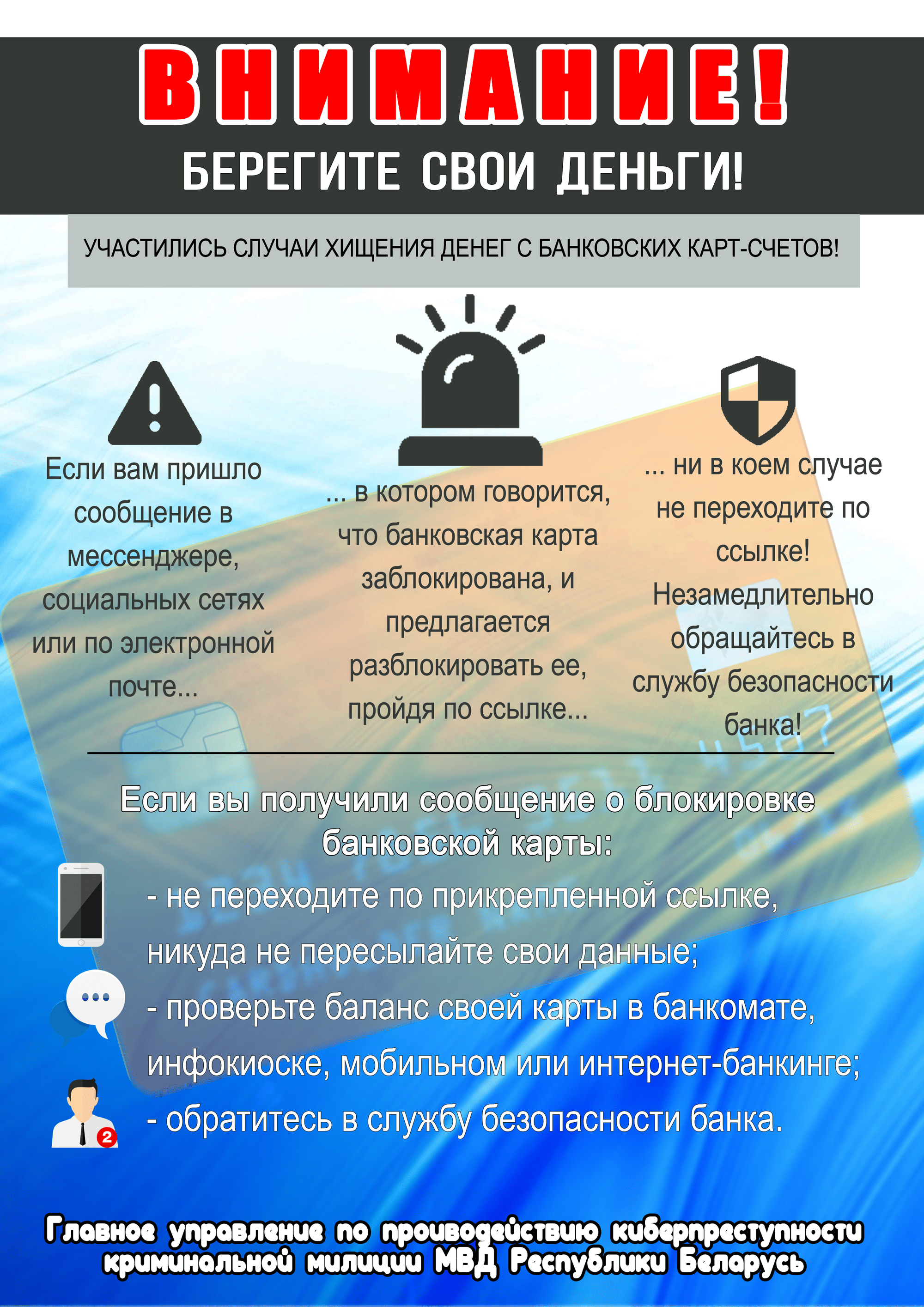 Уважаемые граждане, если Вам поступил звонок в мессенджере или по мобильной связи от неизвестного лица, которое в ходе разговора представилось сотрудником банка и под любым предлогом пытается узнать у Вас реквизиты банковской карты или паспортные данные, ни в коем случае не сообщайте их, это мошенники, которые хотят похитить ваши денежные средства. Настоящие сотрудники банка никогда не будут спрашивать реквизиты банковской карты и паспортные данные, а также звонить Вам при помощи мессенджера «Вайбер»! Также обращайте внимание на абонентский номер, который Вам звонит по мобильной связи и в звонках, которые поступают в мессенджере «Вайбер». Не отвечайте на вызов от абонентских номеров с кодами +373, +370, +372, +376 и иных кодов. Официальный код Республики Беларусь «+375»!!!