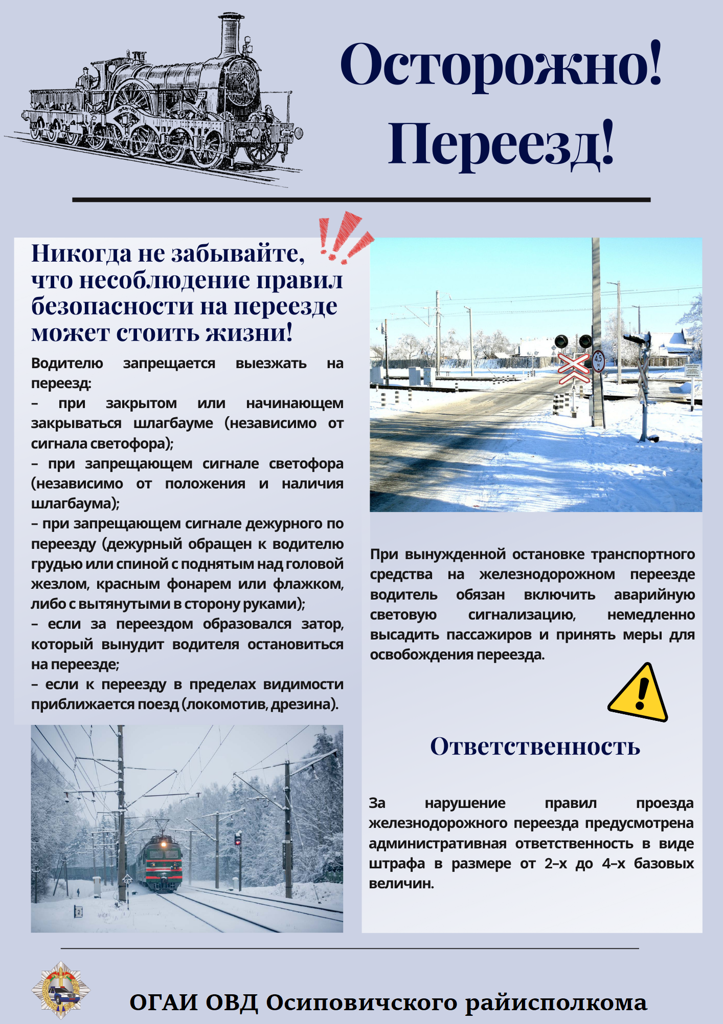 За нарушение правил проезда железнодорожного переезда предусмотрена административная ответственность в виде штрафа в размере от 2-х до 4-х базовых величин.