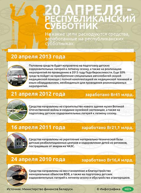 В этот день наша область планирует заработать 6,5 миллиарда рублей. Половина средств пойдет на приобретение реанимационных автомобилей для скорой медпомощи, остальные деньги будут направлены на подготовку местных оздоровительных лагерей к летнему сезону, в т.ч. на развитие и укрепление их материально-технической базы. Планируется, что в субботнике примут участие примерно 0,5 миллиона жителей. И, как отметил заместитель председателя Могилевского облисполкома Валерий Малашко, все районы сориентированы на то, чтобы для работ на субботнике был выбран знаковый объект. В частности, аппарат облисполкома во главе с председателем Петром Рудником будет работать в больнице скорой медицинской помощи на строительстве корпуса.