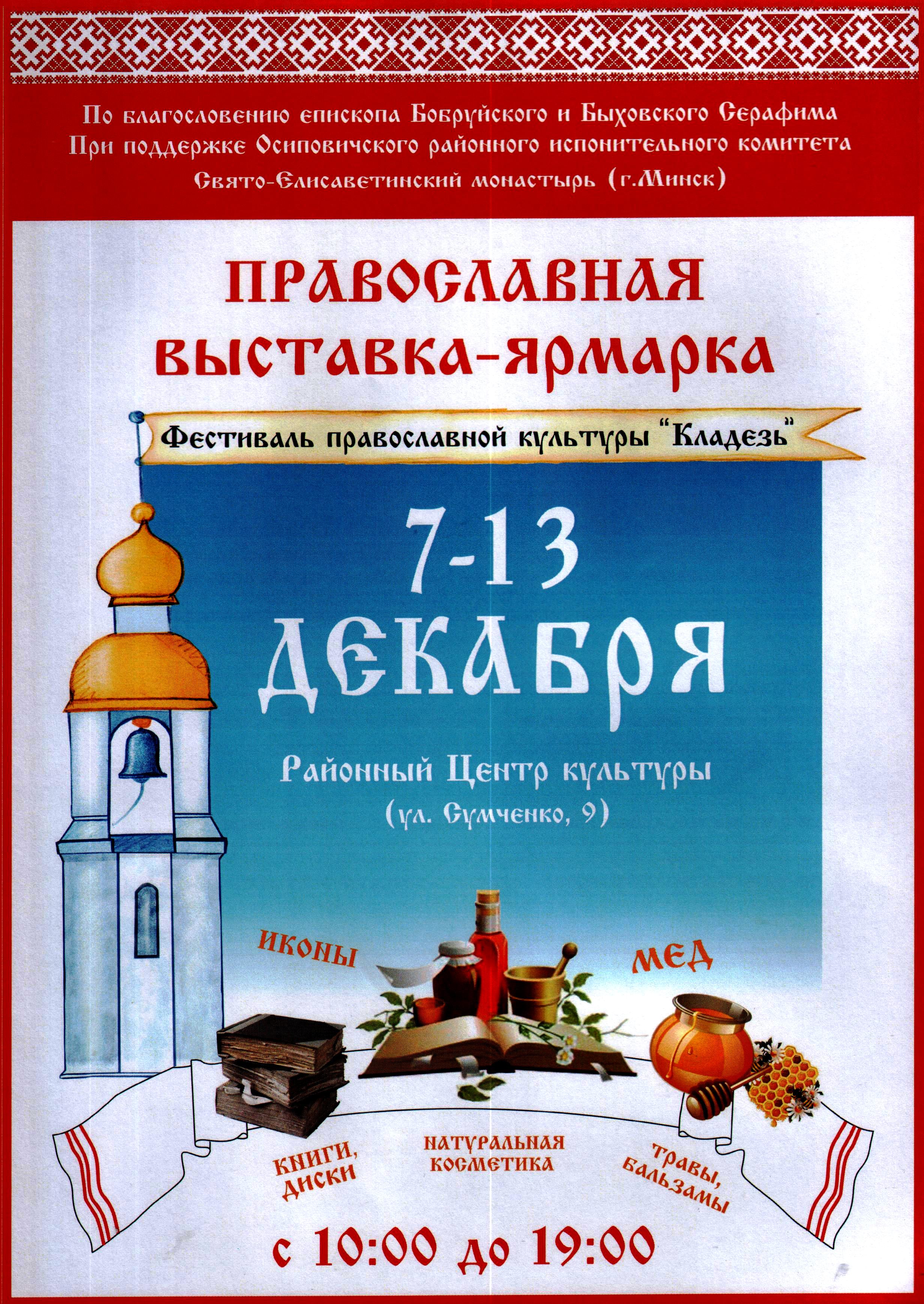 Из года в год фестиваль православной культуры "Кладезь", главные организаторы которого Свято-Елисаветинский монастырь и сестричество в честь святой преподобномученицы великой княгини Елисаветы города Минска, посещает разные города Беларуси.При поддержке Осиповичского райисполкома и Бобруйской епархии с 7 по 13 декабря фестиваль порадует своей программой наших жителей. Церемония открытия состоится в районном Центре культуры. Здесь пройдут показы фильмов "Доброе кино", представления кукольного театра "Батлейка", экскурсии по экспозиции, посвященной Евфросинии Полоцкой. В рамках фестивальной недели в учебных заведениях, больницах и предприятиях запланированы встречи-беседы, направленные на поддержание духовности и укрепление христианских ценностей. "Добрые книги", "Молодость — время выбора", "Общее дело", "Преодоление", "Православные святыни Беларуси" — проекты, которые на протяжении нескольких лет с успехом реализовываются в Беларуси, станут частью духовно-просветительской программы. В них принимают участие не только монашествующие и сестры милосердия, но и священники, культурологи, психологи. Вместе с фестивалем в город прибывают иконы c частичками мощей святых первоверховных апостолов Петра и Павла, а также святого мученика целителя Пантелеимона, которые будут находиться все это время на территории выставки-ярмарки. Здесь же каждый сможет приобрести изделия монастырских мастерских и монастырской аптеки, продукцию монастырского подворья, духовную литературу и многое другое. Посетителей ждет большой выбор оригинальных сувениров и подарков к Рождеству и Новому году. Особая ценность такого приобретения в том, что все сделано с любовью и молитвой, а средства, полученные от продажи, будут потрачены на благотворительные цели. Продолжая дело своей покровительницы, насельницы монастыря и сестры милосердия оказывают помощь болящим и страждущим, детям и взрослым с особенностями психофизического развития, малообеспеченным и многодетным семьям, участвуют в реабилитации освободившихся из мест лишения свободы, больных алкоголизмом и наркоманией, инвалидов. При монастыре, в том числе и в монастырских мастерских, нашли применение своим способностям люди страждущие: бывшие алкоголики, заключенные, наркоманы. Через труд и молитву их души возрождаются к новой жизни.У каждого посетителя выставки-ярмарки есть возможность внести свой вклад в благотворительную деятельность монастыря.