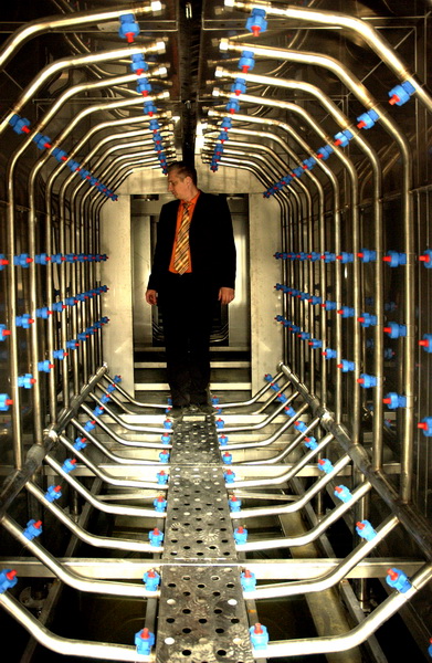 НА ЗДЫМКУ: намеснік галоўнага інжынера ААТ “АЗАА” Віктар Брыткевіч на завадской новабудоўлі ведае кожны куток. А найбольш яму падабаецца камера, прызначаная для ачысткі дэталей. У якасці мыючага сродку ў ёй ужываецца звычайная вада, але выцякае яна са спецыяльных фарсунак пад такім высокім ціскам, што шматлікія струменьчыкі набываюць уласцівасці наждачнай паперы.