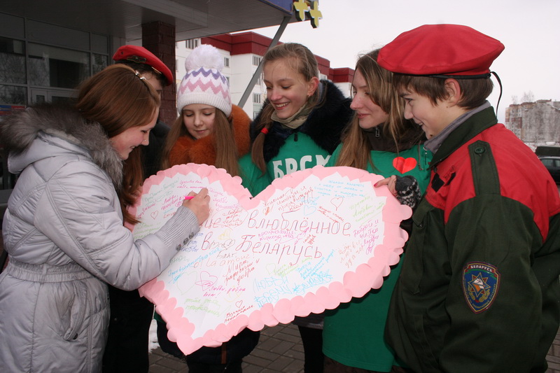 Па-асабліваму адзначылі свята ўсіх закаханых члены "пярвічкі" грамадскага аб’яднання "БРСМ" СШ № 4: юнакі і дзяўчаты правялі акцыю “Сэрца, улюблёнае ў Беларусь”.