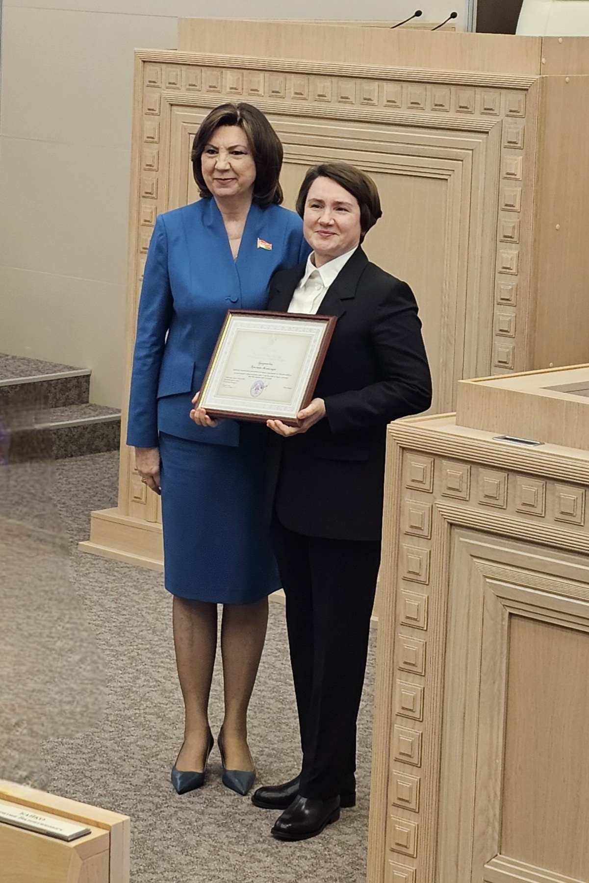Кульминацией встречи стала церемония награждения. Среди тех, кто удостоился Благодарности Председателя Совета Республики, — представительницы Могилевской области. Высокой награды были удостоены директор КПУП «Могилевзеленстрой» Кристина Автушкова и начальник планово-экономического отдела КУП «Могилевский областной центр информационных систем» Елена Маторина.