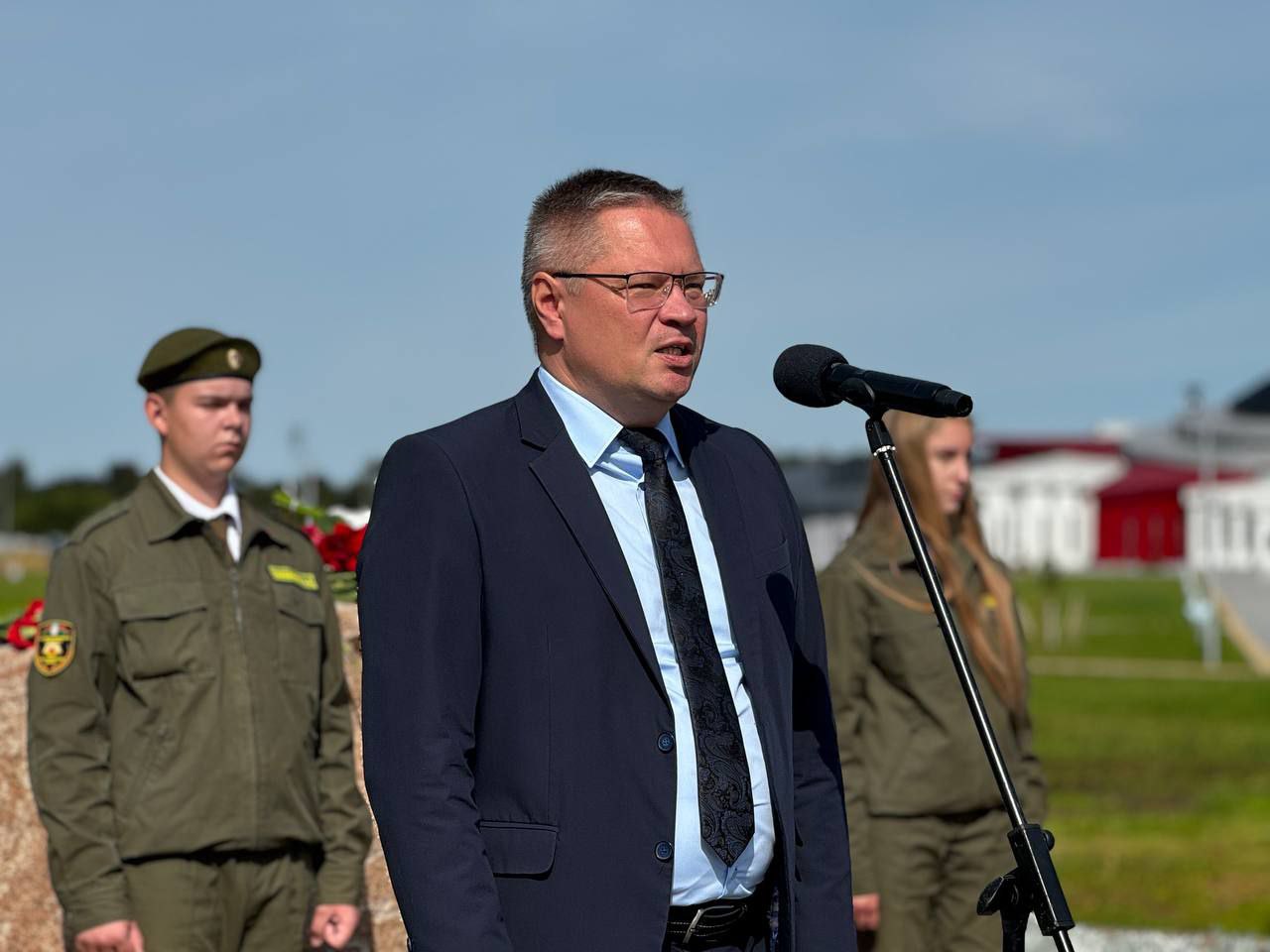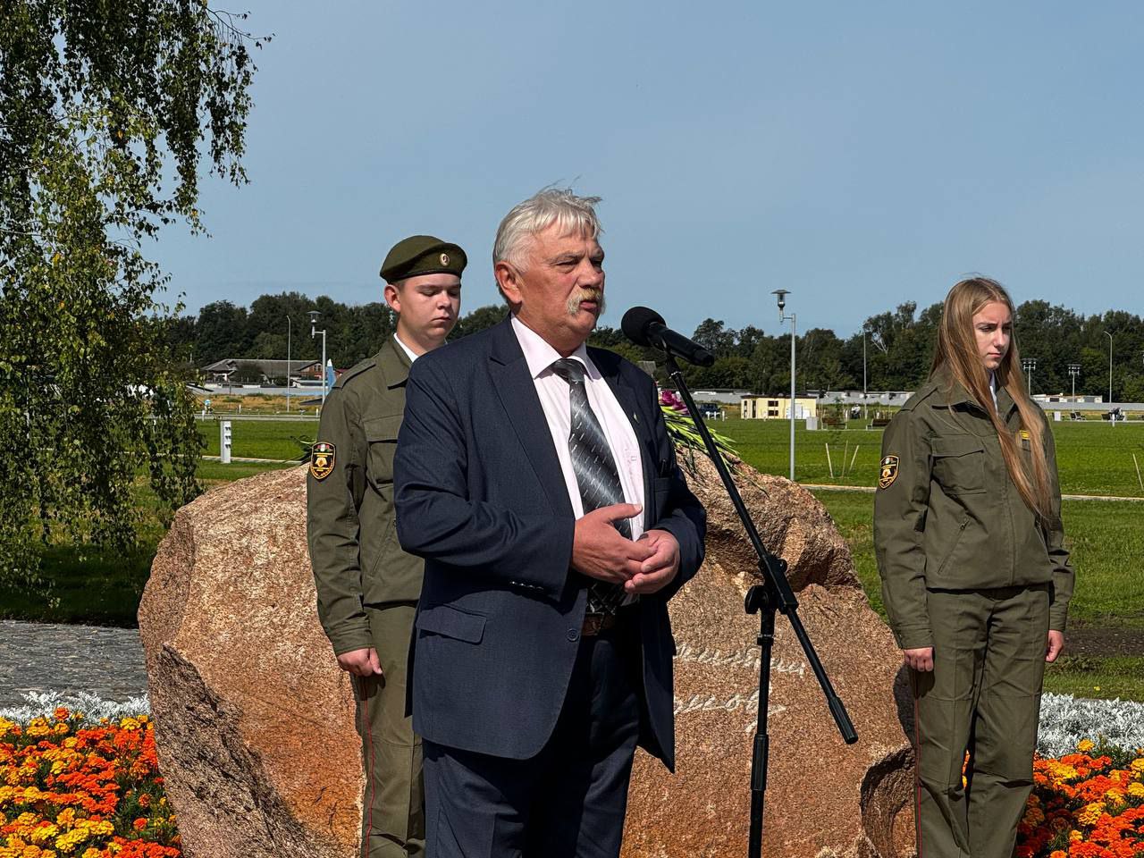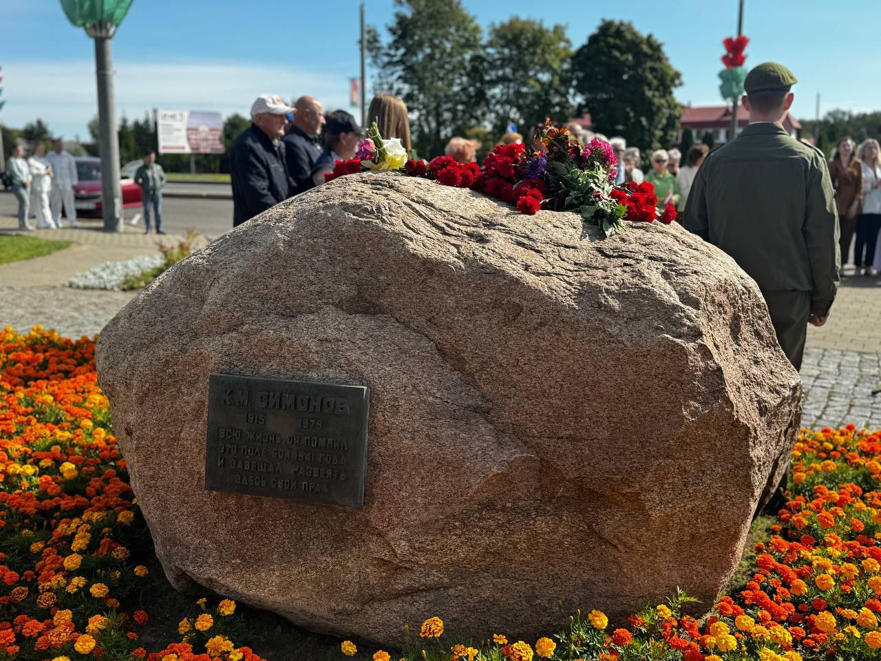 На мемориальном комплексе «Буйничское поле» у камня Константину Симонову собрались жители Могилева, а также гости из России, чтобы почтить память советского поэта, писателя, журналиста, военного корреспондента.