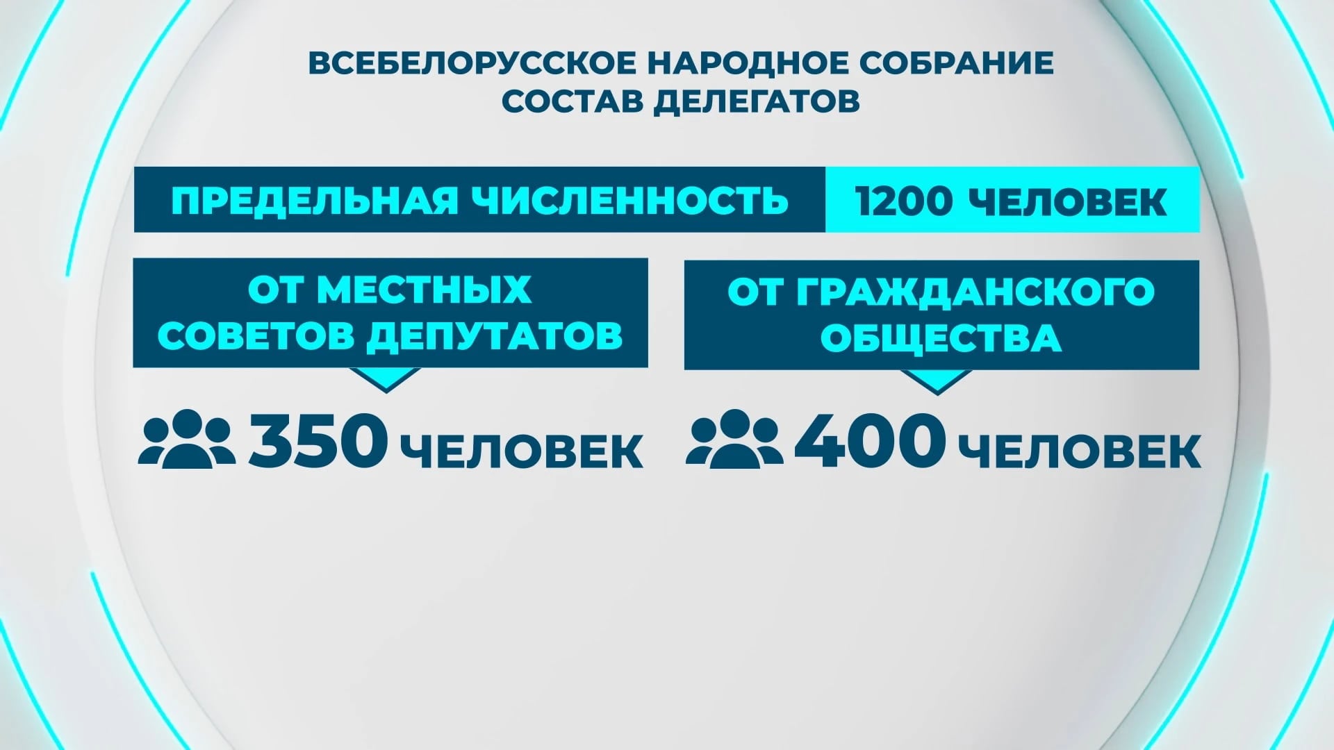 Что касается состава нынешнего Всебелорусского народного собрания, его предельная численность 1200 человек. Это представители всех ветвей власти, местных Советов депутатов и гражданского общества: люди разных профессий и возрастных групп.