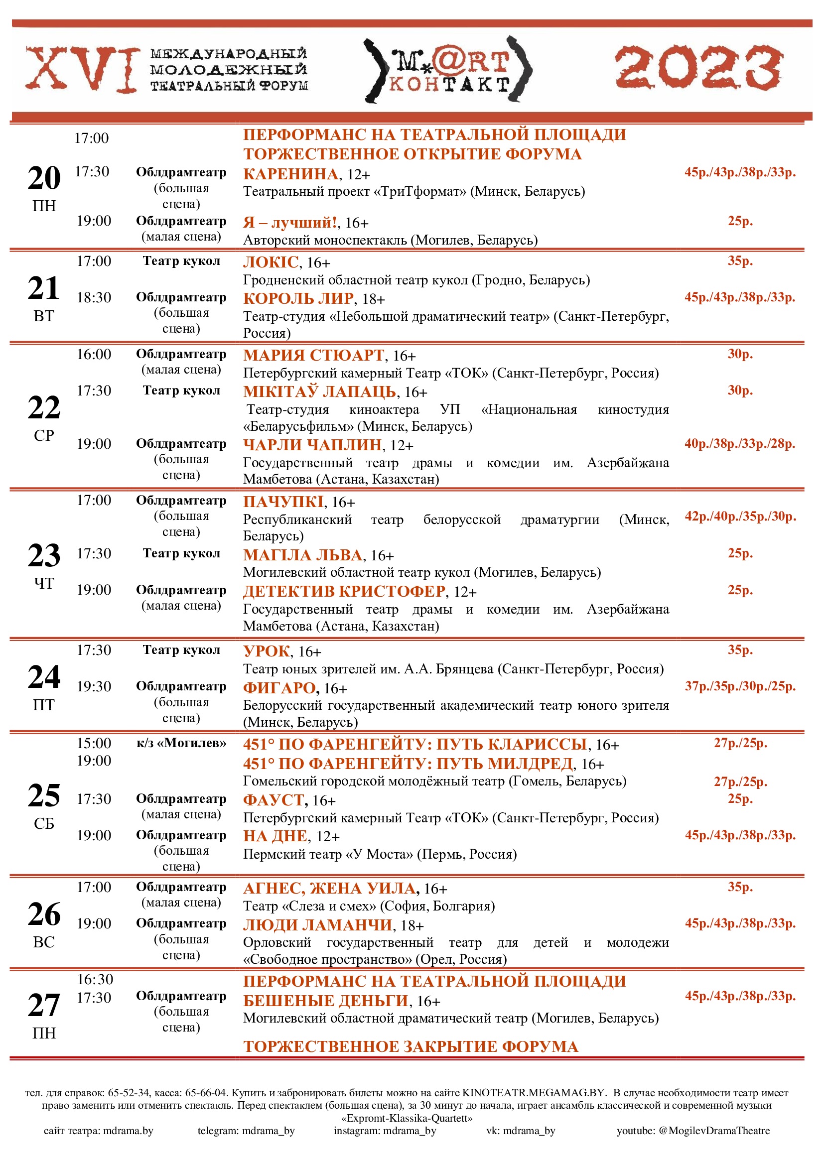 XVI Міжнародны маладзёжны тэатральны форум «М.@rt.кантакт», заснавальнікамі якога з'яўляюцца Міністэрства культуры Рэспублікі Беларусь і Магілёўскі аблвыканкам, пройдзе ў Магілёве з 20 па 27 сакавіка.