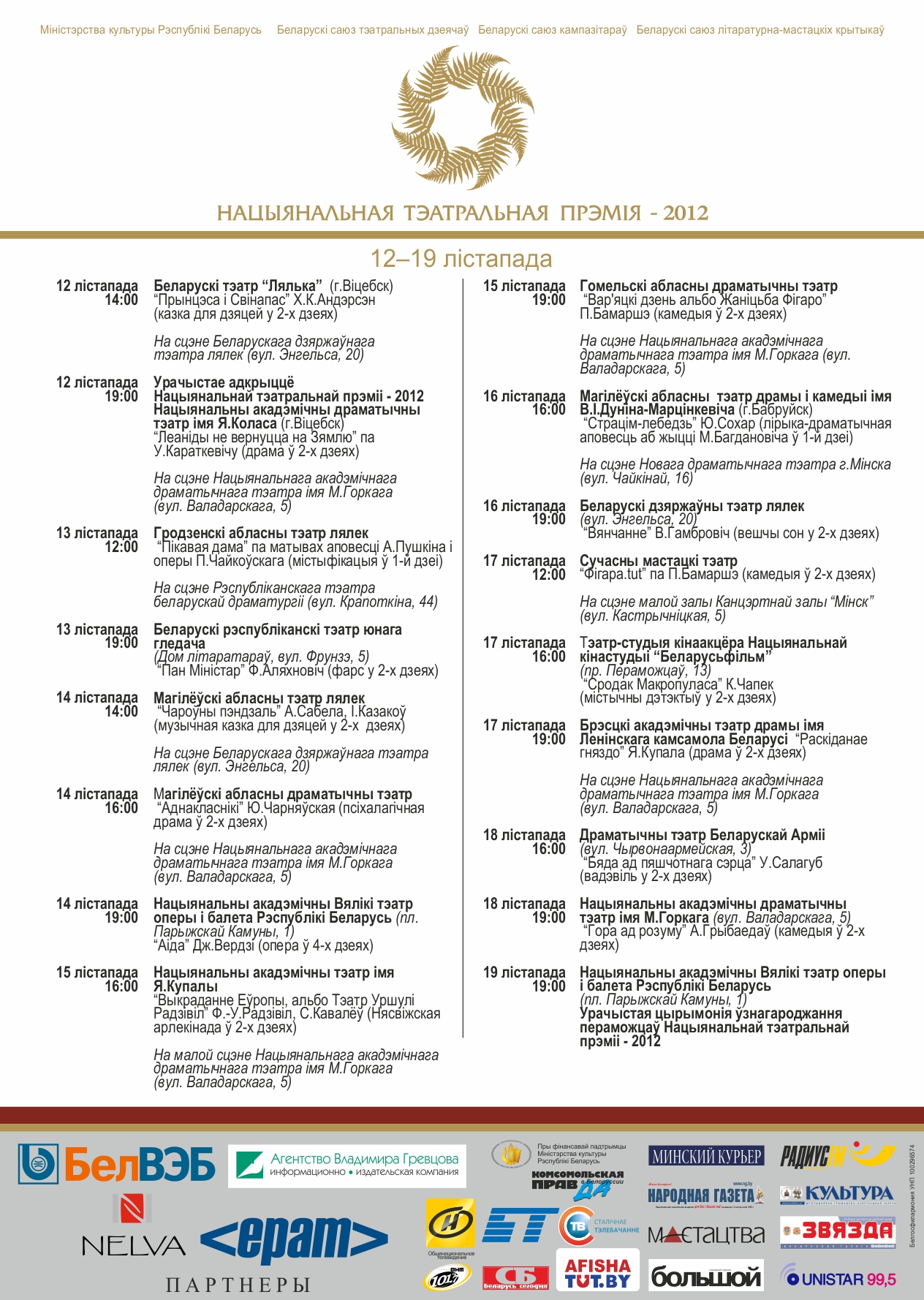 Показ данных спектаклей-номинантов состоится с 12 по 19 ноября 2012 года на столичных площадках: на сцене Национального академического драматического театра им.Горького, Нового драматического театра г.Минска, Республиканского театра белорусской драматургии, Белорусского государственного театра кукол, Драматического театра Белорусской Армии, театра-студии киноактера Национальной киностудии «Беларусьфильм», Национального академического Большого театра оперы и балета Республики Беларусь, концертного зала «Минск».