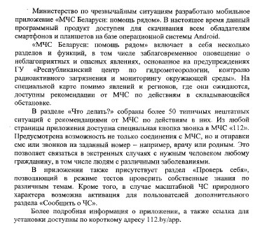 Министерство по чрезвычайным ситуациям разработало мобильное приложение "МЧС Беларуси: помощь рядом". В настоящее время данный программный продукт доступен для скачивания всем обладателям смартфонов и планшетов на базе операционной системы Android.