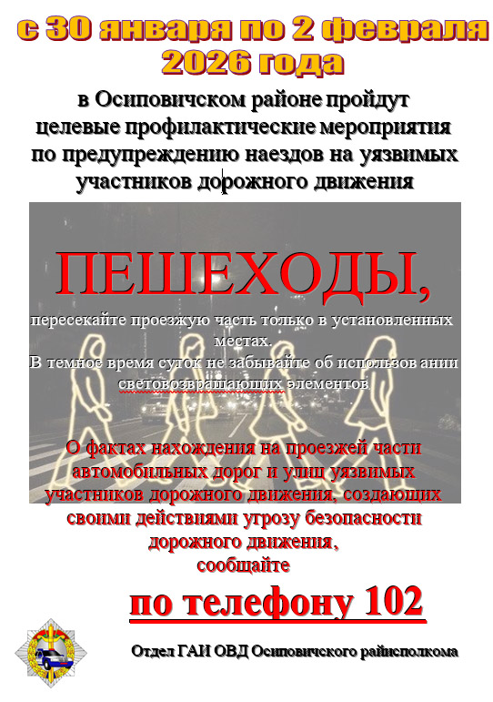 C 30 января по 2 февраля в Осиповичском районе пройдут целевые профилактические мероприятия по предупреждению наездов на уязвимых участников дорожного движения