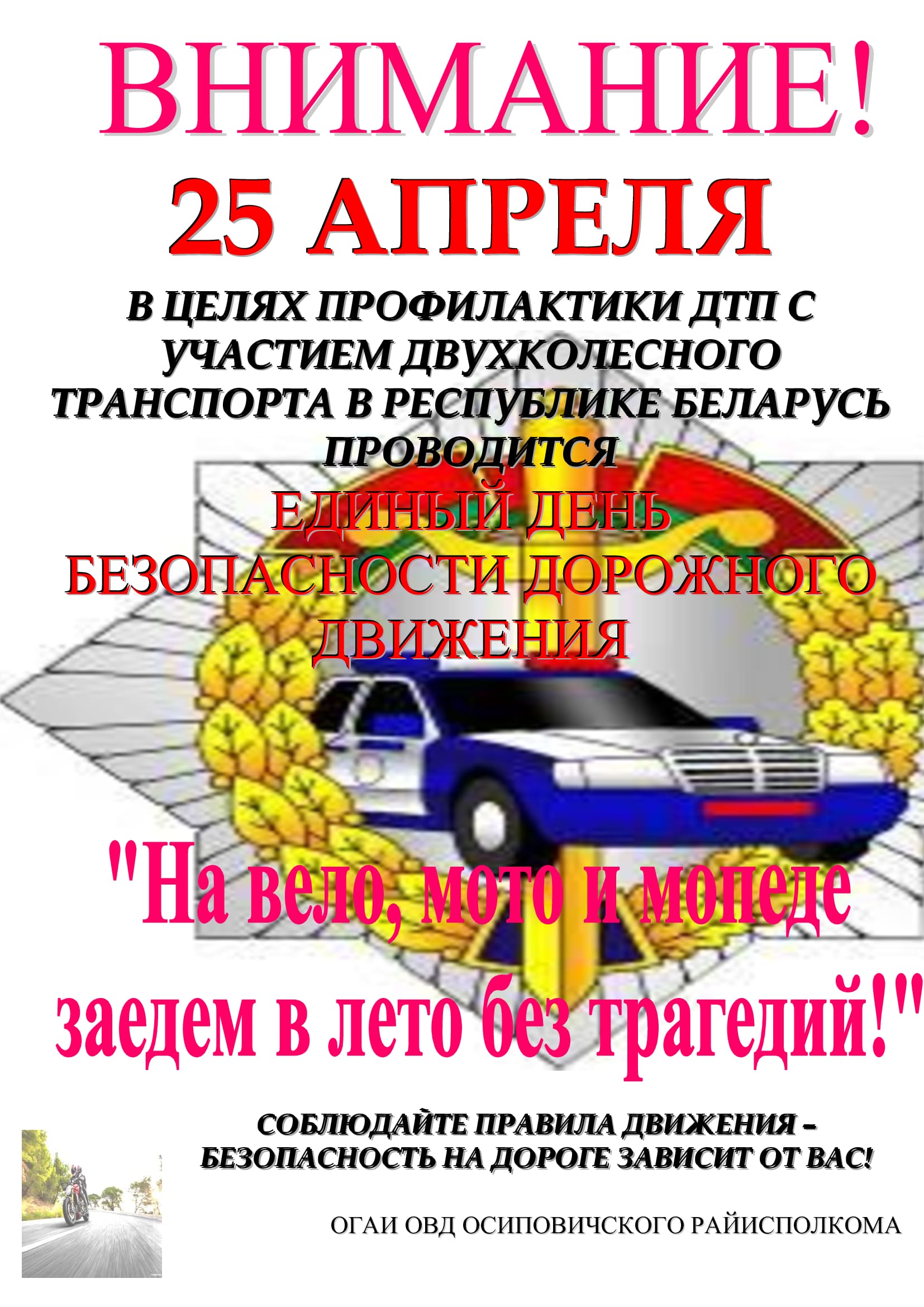 С целью пропаганды безопасности дорожного движения при эксплуатации двухколесного транспорта, формирования взаимовежливых отношений между участниками движения и пресечения противоправных действий со стороны мотоциклистов и велосипедистов 25 апреля Госавтоинспекцией проводится Единый день безопасности дорожного движения под девизом «На вело, мото и мопеде заедем в лето без трагедий!».