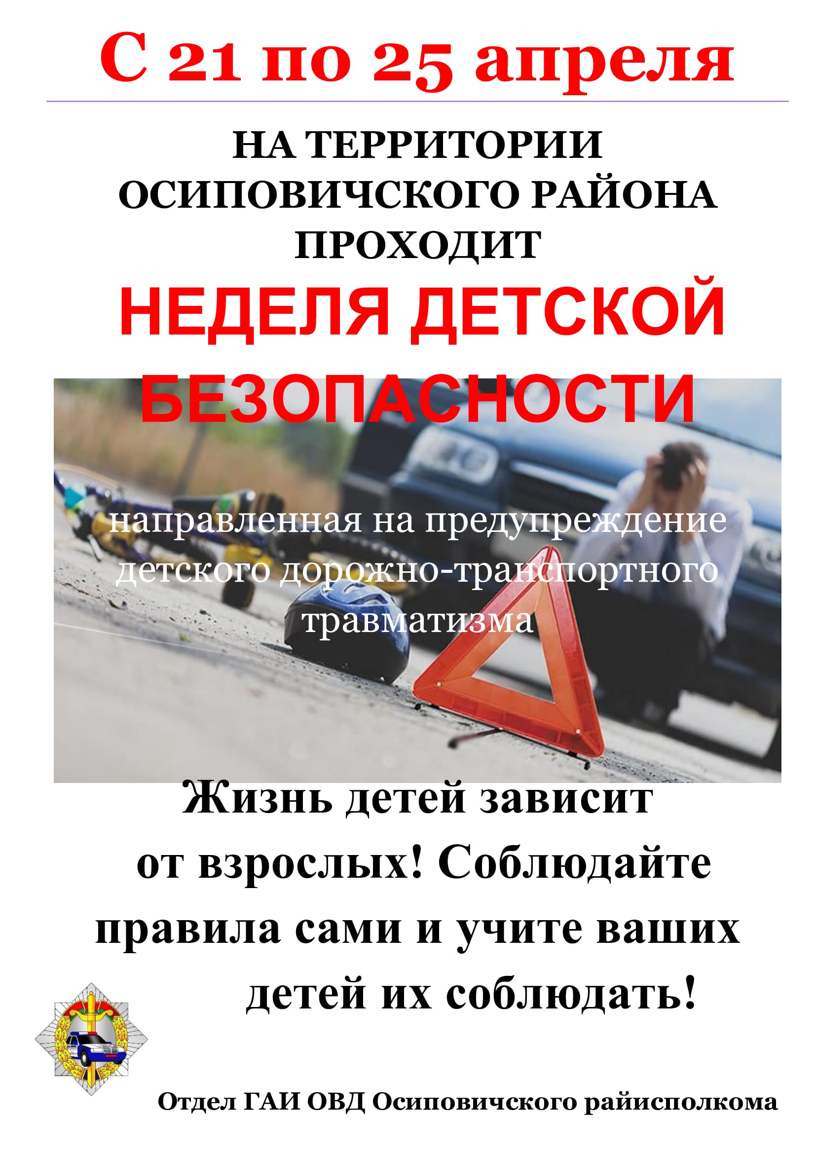 С 21 по 25 апреля в Осиповичском районе проходит Неделя детской безопасности. Главная цель мероприятия – своевременное предупреждение дорожно-транспортных происшествий с участием несовершеннолетних.