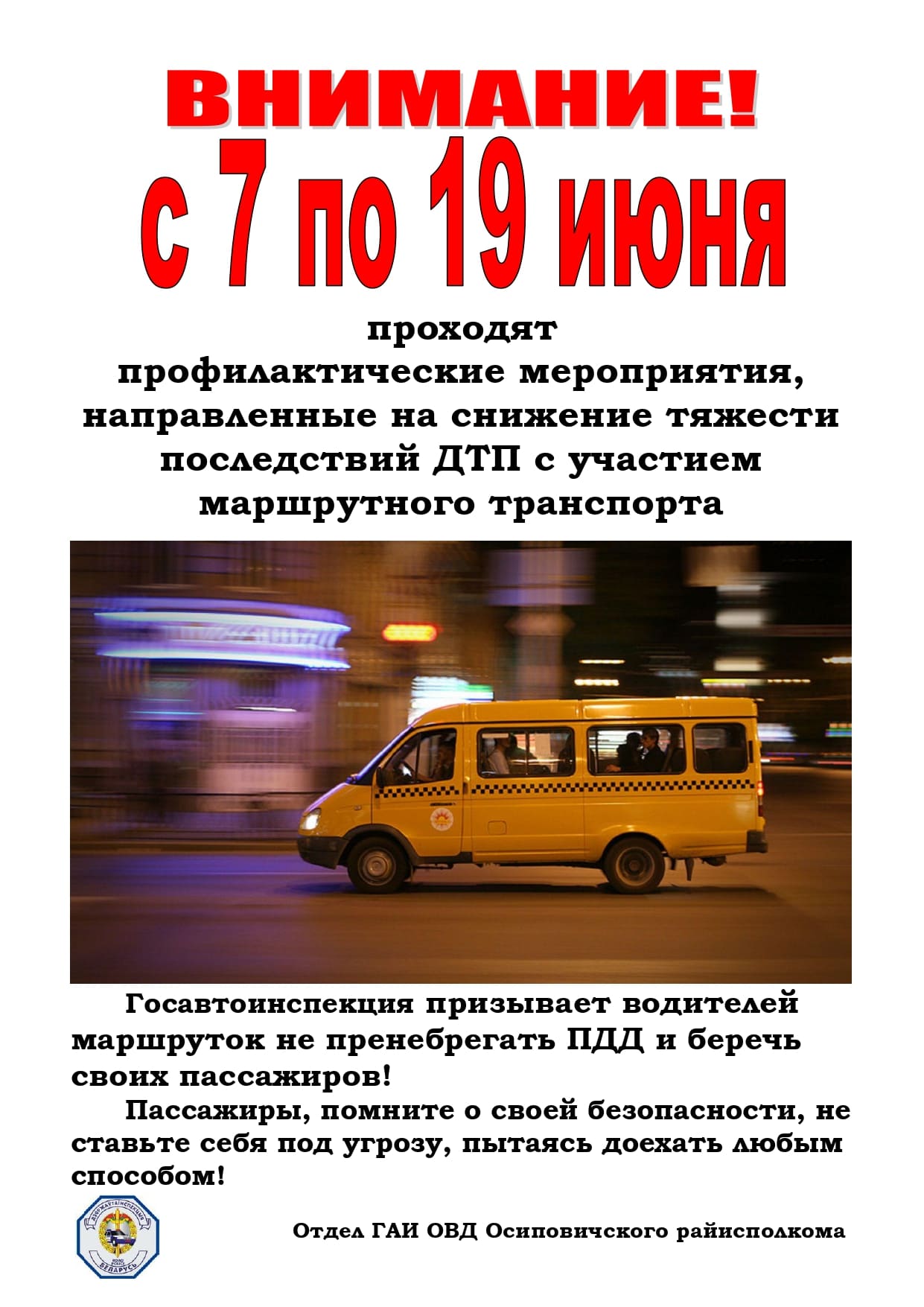 Внимание! С 7 по 19 июня проходят профилактические мероприятия, направленные на снижение тяжести последствий ДТП с участием маршрутного транспорта