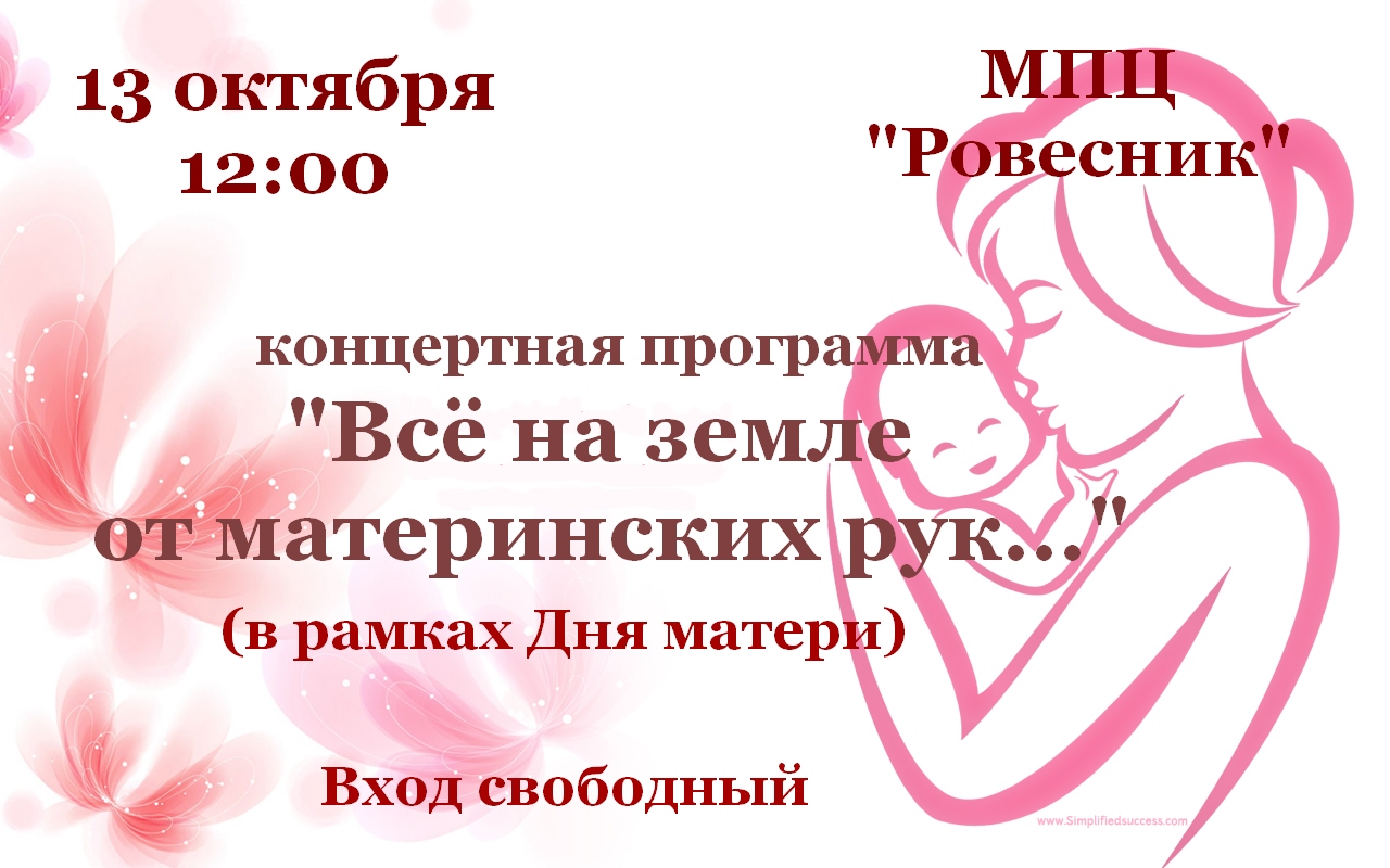 13 октября в 12.00 в МПЦ "Ровесник" состоится концертная программа, посвященная Дню матери. Вход свободный