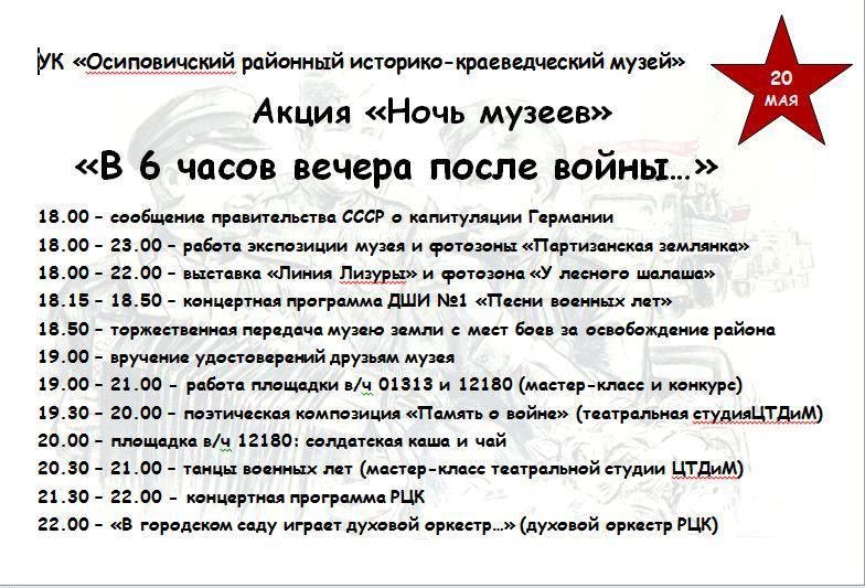 20 мая в Осиповичском районном историко-краеведческом музее пройдет акция «Ночь музеев»: «В 6 часов вечера после войны…»