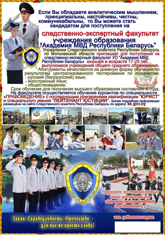 Осиповичский районный отдел Следственного комитета Республики Беларусь проводит отбор кандидатов для поступления на следственно-экспертный факультет учреждения образования «Академия Министерства внутренних дел Республики Беларусь» юношей в возрасте от 17 лет, выпускников учреждений общего среднего, профессионально-технического либо среднего специального образования, не имеющих по состоянию здоровья противопоказаний для прохождения срочной военной службы. Абитуриенты зачисляются на дневную форму обучения по результатам централизованного тестирования по предметам: русский (белорусский) язык; иностранный язык; обществоведение. Срок обучения для получения высшего образования 4 года. На факультете осуществляется обучение курсантов по специальности «ПРАВОВЕДЕНИЕ» с последующим присвоением квалификации «ЮРИСТ» и специального звания «ЛЕЙТЕНАНТ ЮСТИЦИИ». Более подробная информация размещена на сайте Следственного комитета Республики Беларусь по адресу: sk.gov.by.