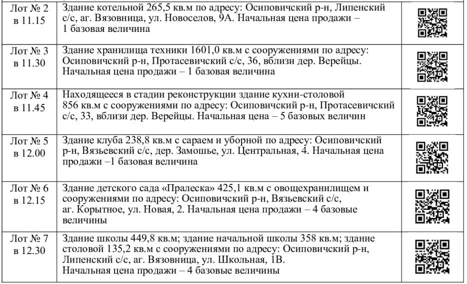 Продавцы недвижимого имущества: лот №№ 2-4 – Осиповичское унитарное коммунальное предприятие жилищно-коммунального хозяйства, тел. 8(02235)60877, 66037, лот № 5 – отдел культуры Осиповичского районного исполнительного комитета, тел. 8(02235)66094, 66037, лот №№ 6-7 – отдел по образованию Осиповичского районного исполнительного комитета, тел. 8(02235)53177, 66037.