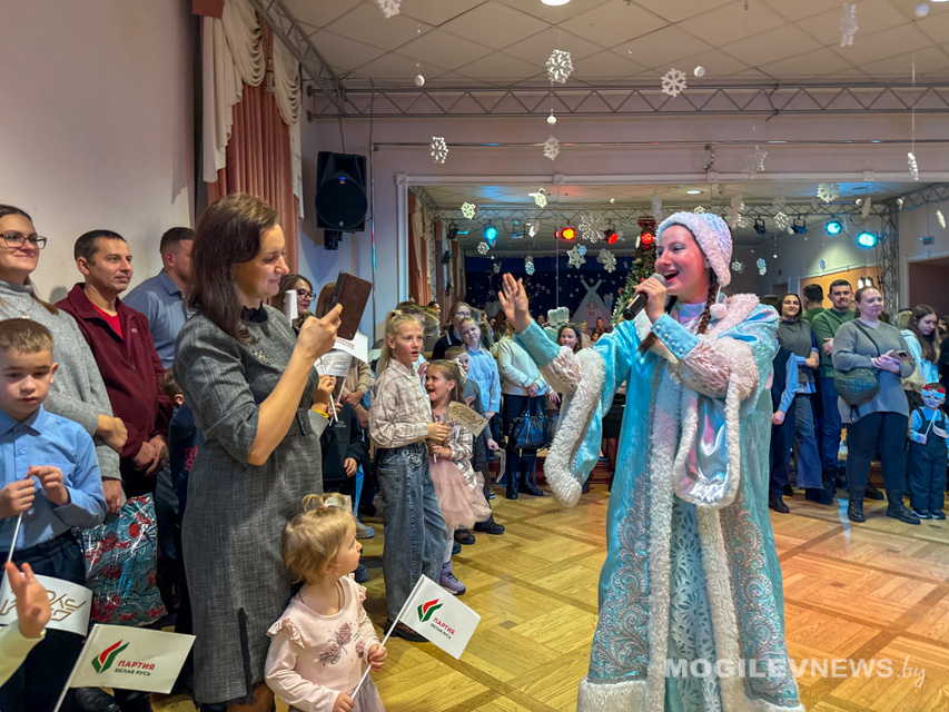 Программа праздника погрузила детей и их родителей в мир чудес с первых минут. Вместе они посмотрели добрый и мудрый спектакль «Про Емелю и Щуку-волшебницу», который унес зрителей в мир народной сказки, где доброта и смекалка всегда побеждают. А после представления, под сияющей огнями новогодней красавицей-елкой, развернулось яркое интерактивное шоу с веселыми хороводами, играми и поздравлениями. Поздравить ребят пришел не только руководитель областного отделения партии «Белая Русь», но и руководители районных отделений: Ленинского и Октябрьского районного отделения г. Могилева Алеся Дудкова и Петр Соловьев, Могилевского районного отделения Наталья Комарова, Белыничского районного отделения Галина Наливайко, Круглянского районного отделения Светлана Матюшевская, а также представители штаба молодежного движения «Искра» и секретариата Валентина Шергилашвили и Александра Ващенка.