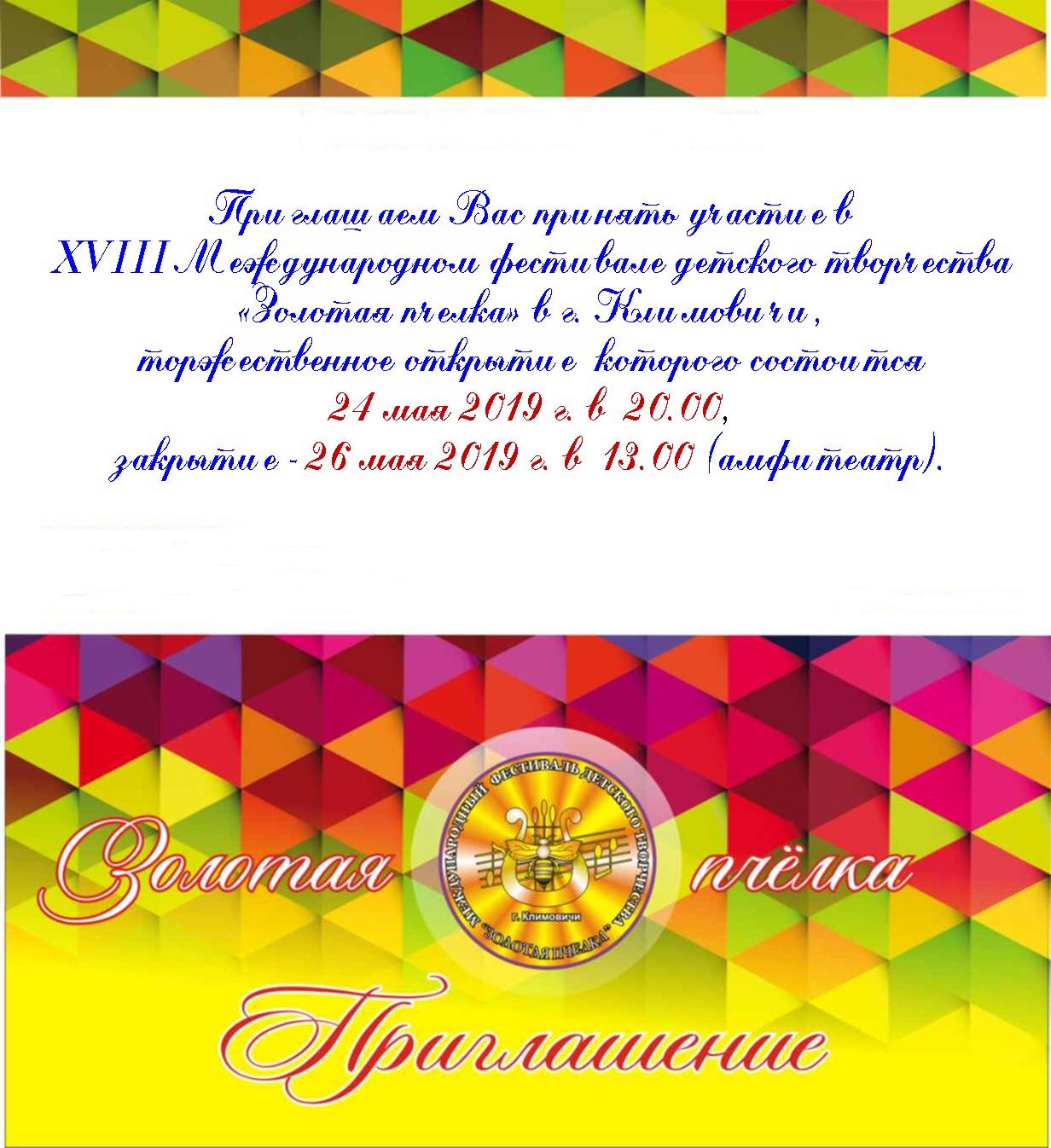 С 24 по 26 мая 2019 г. в г.Климовичи состоится XVIII Международный фестиваль детского творчества "Золотая пчёлка"
