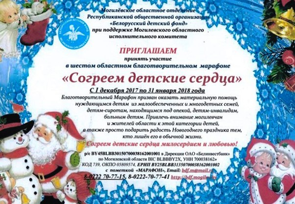 Могилевское областное отделение Республиканской общественной организации «Белорусский детский фонд» с 1 декабря 2017 по 31 января 2018 при поддержке Могилевского областного исполнительного комитета в рамках республиканской акции «Наши дети» проводит областной благотворительный марафон «Согреем детские сердца».