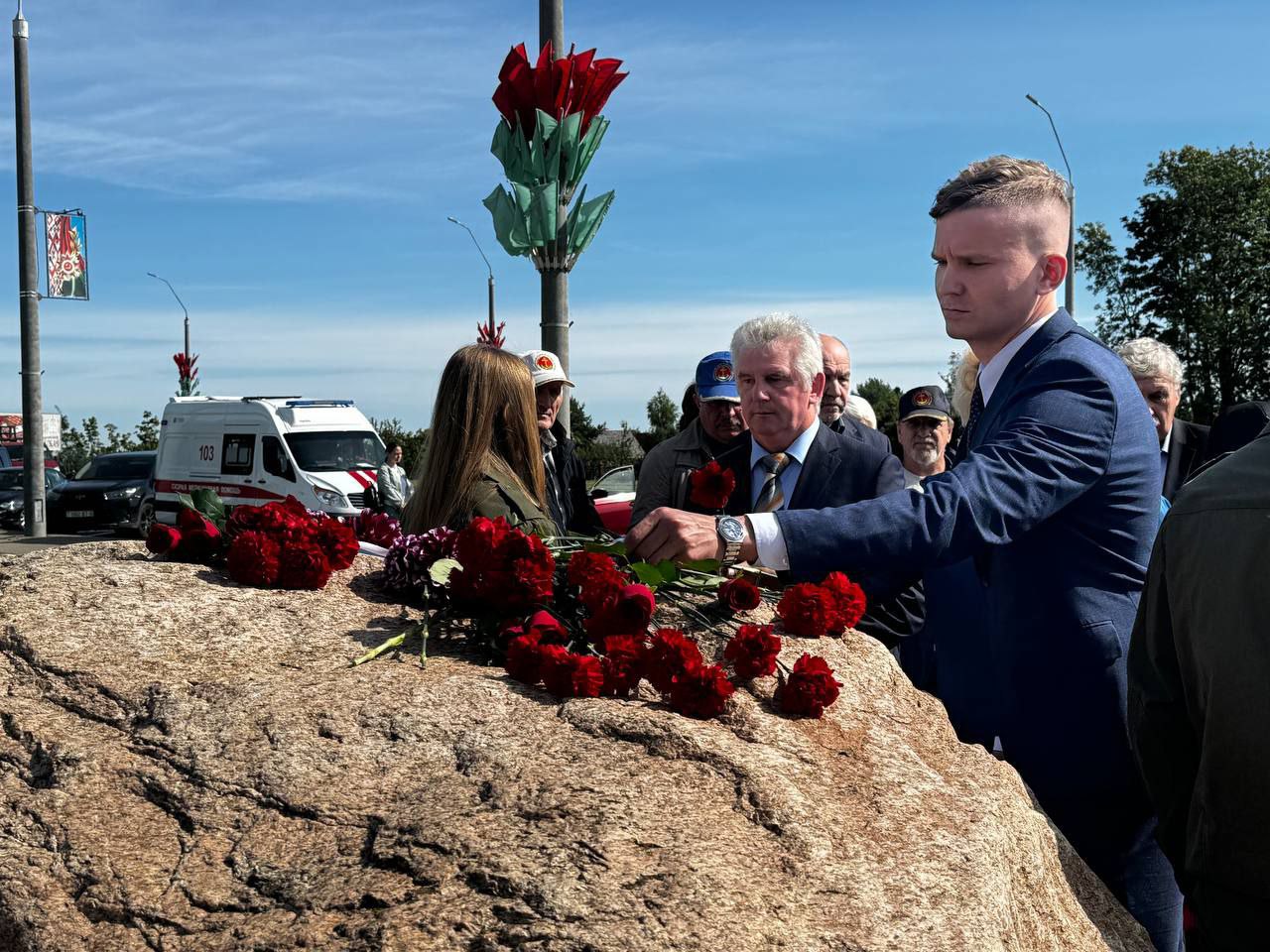 На мемориальном комплексе «Буйничское поле» у камня Константину Симонову собрались жители Могилева, а также гости из России, чтобы почтить память советского поэта, писателя, журналиста, военного корреспондента.