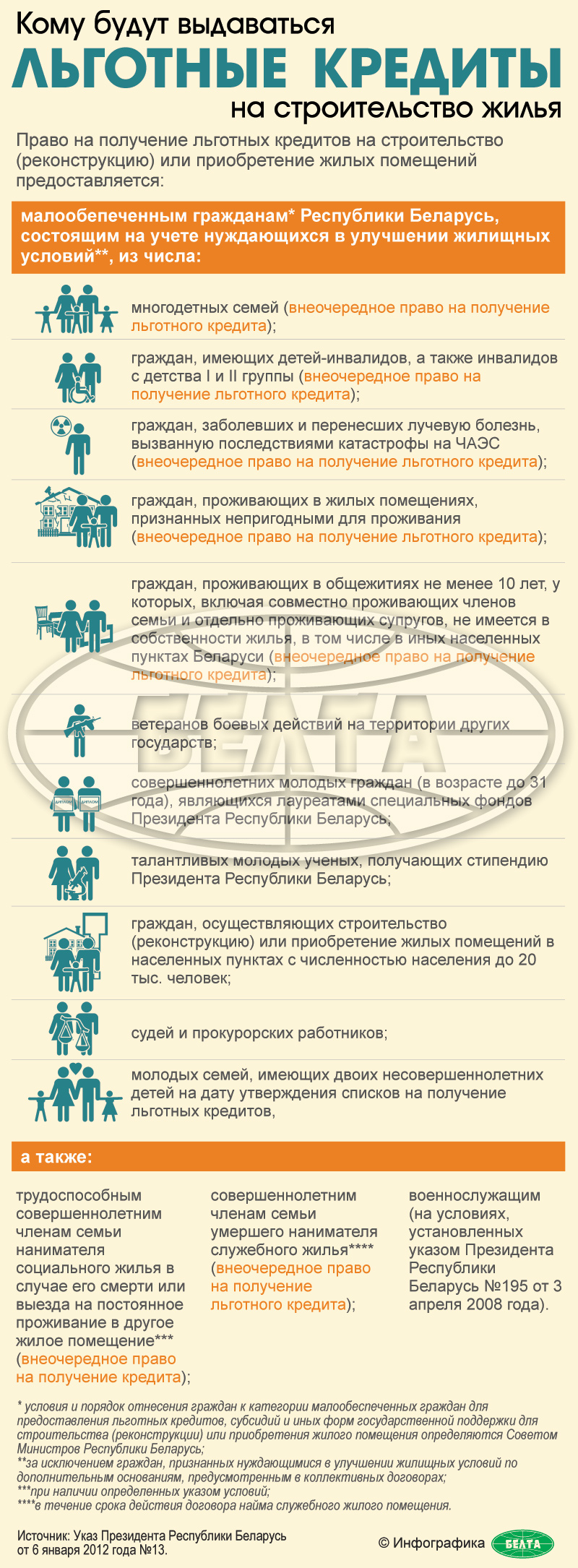 В Беларуси согласно новым условиям льготные кредиты на строительство жилья получат 30-35% нуждающихся в улучшении жилищный условий. Об этом сообщил корреспонденту БЕЛТА начальник управления жилищного строительства Министерства архитектуры и строительства Александр Горваль, комментируя указ №13 "О некоторых вопросах предоставления гражданам государственной поддержки при строительстве (реконструкции) или приобретении жилых помещений" от 6 января 2012 года.